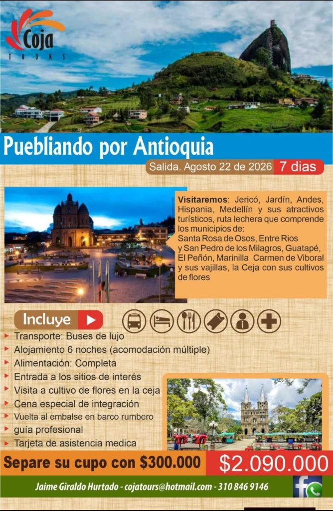 An additional excursion is “Puebliando por Antioquia”, a relaxing journey that allows you to discover many of the region’s traditional villages.