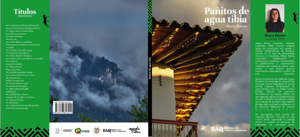 Testimonio del poder de la poesía en las nuevas generaciones del Quindío, con su escritura este libro se abre al mundo literario regional y nacional mostrándonos una voz fresca, honesta y valiente que presagia una trayectoria capaz de seguir creciendo porque en estos poemas vive una vocación verdadera que nombra y comprende la vida a través del dolor: “Estoy cansada de tener fe, /de creer en un país sin esperanza”. En la poesía de Shara Bueno, Armenia es un organismo enfermo respirando a través de los cuerpos de quienes la habitan. Sus versos cargan la zozobra del tránsito y el tedio de los días y la rabia de saberse joven en un país que ofrece cada vez menos esperanzas; no disfrazan el dolor con metáforas hermosas, lo dejan visible con la valentía de quien aprende que la poesía también puede ser una herida abierta. En sus 42 poemas, algunos cercanos a la prosa poética, Bueno cimenta una radiografía citadina desde la angustia y la lucidez. Títulos como Ventana artificial, Juventud, Dudo que pueda escribir poemas tan malos como los míos o La colada más salada del mundo, evidencian una mirada irónica y dolida frente a la vida urbana y familiar, la pérdida de sentido y el desgaste de la esperanza levantándose como bitácora íntima donde el dolor personal y la crisis social se entrelazan. Con mezcla de ternura y desesperanza, la poeta observa y describe la cotidianidad suya y ajena, consciente de que la realidad social y económicamente convulsa del país atraviesa la piel y la palabra. Sus poemas son resistencia emocional, “pañitos de agua tibia” que no curan, pero sostienen: “El enojo llegó de muchas formas, entre ellas, por medio de los obstáculos constantes que enfrentamos los artistas al intentar crear espacios para la vida y el arte”.