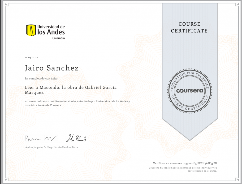 Plataforma: Coursera Duración: Aproximadamente 20 horas (4 semanas, 4-5 horas por semana) Idioma: Español Instructores: Expertos en literatura latinoamericana de Uniandes.